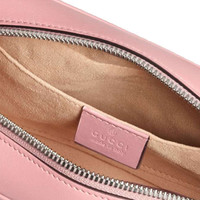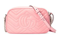 Pastels push the color focus throughout the Pre-Fall 2020 collection, in soft, vibrant hues, including this light pink shade presented in matelassé leather with a chevron design. The softly structured small GG Marmont chain shoulder bag is finished with a zip top closure and the recognizable Double G. The chain shoulder strap has a leather shoulder detail for added comfort. - Pastel pink matelassé chevron leather with GG - Palladium-toned hardware - Microfiber lining with a suede-like finish - Double G - Interior open pocket - Adjustable chain shoulder strap with 23.5" drop. Can also be worn as a crossbody bag. - Zipper closure with elongated zipper pullers - Weight: .394kg approximately - Small size: 9.5"W x 5"H x 3"D - Made in Italy - The model is 5'9" tall