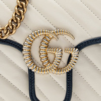 The GG Marmont bag is introduced in white diagonal matelassé quilted leather for Pre-Fall 2020, completed with a twisted torchon Double G embellishment. The small chain shoulder bag's distinct softly structured shape is outlined in contrast dark blue piping, highlighting its flap closure. The sliding chain strap smoothly transforms from a single shoulder length to a doubled top handle length for multiple ways to wear the bag. - White diagonal matelassé leather with a vintage effect - Dark blue leather trim - Gold-toned hardware - Microfiber lining with a suede-like finish - Double G - Interior zipper pocket - Sliding chain strap can be worn as a shoulder strap with 22” drop, as a top handle with 12” drop or as a cross body bag. - Flap with spring closure - This item can fit a cell phone up to 3.1”W x 6.2”H x .3”D - The Gucci card case wallet will fit inside this product - Weight: .648kg approximately - Small size: 10"W x 6"H x 3"D - Made in Italy - The model is 5'9" tall