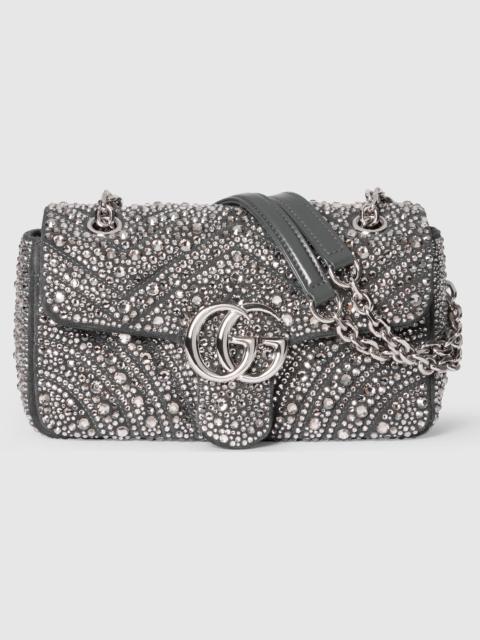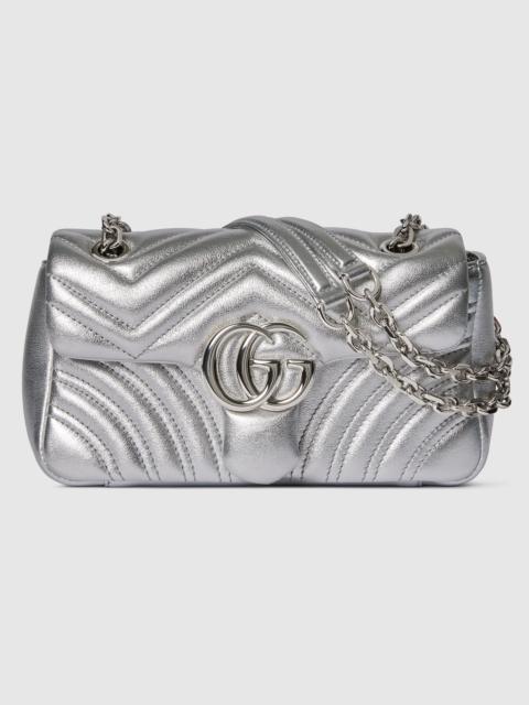The GG Marmont, a signature collection of the House, features the emblematic Double G and a faceted chain strap, presented here in silver-toned finish. Introducing uniquely textured leather, this shoulder bag is further elevated with shearling trim. - Metallic silver textured leather - Shearling trim - Silver-toned hardware - Light blue cotton linen lining - Double G - Inside: 1 open pocket - Sliding chain strap can be worn as a shoulder strap with 21.7" drop - Flap with spring closure - 8.7" x 4.9"H x 2.4" - Weight: 1.2lbs approximately - Made in Italy - Fits iPhone Pro Max/Plus, Airpods, long wallet, and lipstick