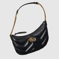 The GG Marmont is synonymous with its matelassé leather and monogram hardware. Crafted from black leather, the small shoulder bag is reimagined with small a Double G. - Black matelassé chevron leather - Gold-toned hardware - Part of the - selection, this product is embedded with NFC technology—an innovative way to authenticate and experience your item digitally. - Microfiber lining with suede like finish - Double G - Inside: 1 open pocket - Shoulder strap drop: 9.2" - Zip closure - Small size: 10.2"W x 6.6"H x 1.5"D - Made in Italy