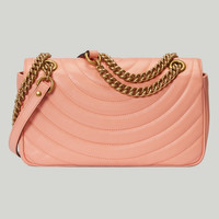 The softly structured shape of the small GG Marmont chain shoulder bag is defined by the antique gold-toned Double G hardware. The sliding chain strap can be worn multiple ways, changing between a shoulder and a top handle bag. Crafted in matelassé leather, it's enriched with curved patterns that play with fresh geometries. - Peach matelassé round and vertical matelassé leather - Antique gold-toned hardware - Microfibre lining with a suede-like finish - Double G - Interior zipper pocket - Sliding chain strap can be worn as a shoulder strap with 21.6" drop or can be worn as a top handle with 11.8" drop. - Flap with spring closure - This item can fit a cell phone up to 3.1"W x 6.2"H x 0.3"D - The Gucci card case wallet will fit inside this product - Weight: 1.42lbs approximately - Small size: 10"W x 6"H x 3"D - Made in Italy