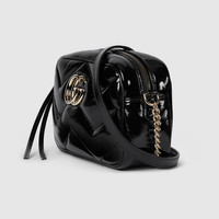 The GG Marmont collection spotlights sophisticated leather in dark tones to welcome Pre-Fall. Crafted in quilted chevron patent leather, this small shoulder bag with a zip closure underlines its contemporary silhouette in black, complete with light gold toned hardware. - Black quilted chevron patent leather - Black patent leather trim - Light gold-toned hardware - Black microfiber lining - Double G - Inside: 1 open pocket - Adjustable leather and chain shoulder strap from 50" to 52.8" - Adjustable leather and chain shoulder strap with 22.4" to 24" drop - Weight: 0.9lbs, approximately - Small size: 9.4" x 5.1" x 2.8" - Fits up to iPhone Pro Max/Plus, small wallet, and lipstick
