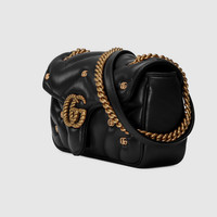 The GG Marmont shoulder bag presents a softly padded version of the black GG Matelassé leather with small Double G studs, and a twisted torchon Double G embellishment. The sliding chain strap smoothly transforms from a single shoulder length to a doubled top handle length for multiple ways to wear the bag. - Black matelassé chevron leather - Gold-toned hardware - Double G studs appliqué - Microfiber lining - Double G - Interior zipper pocket - Sliding chain strap can be worn as a shoulder strap with 21.6" drop or can be worn as a top handle with 11.8" drop. - Flap with spring closure - Weight: 1.42lbs approximately - Small size: 10"W x 6"H x 3"D - Made in Italy - Fits up to: iPhone Pro Max/Plus, Airpods, long wallet, and lipstick