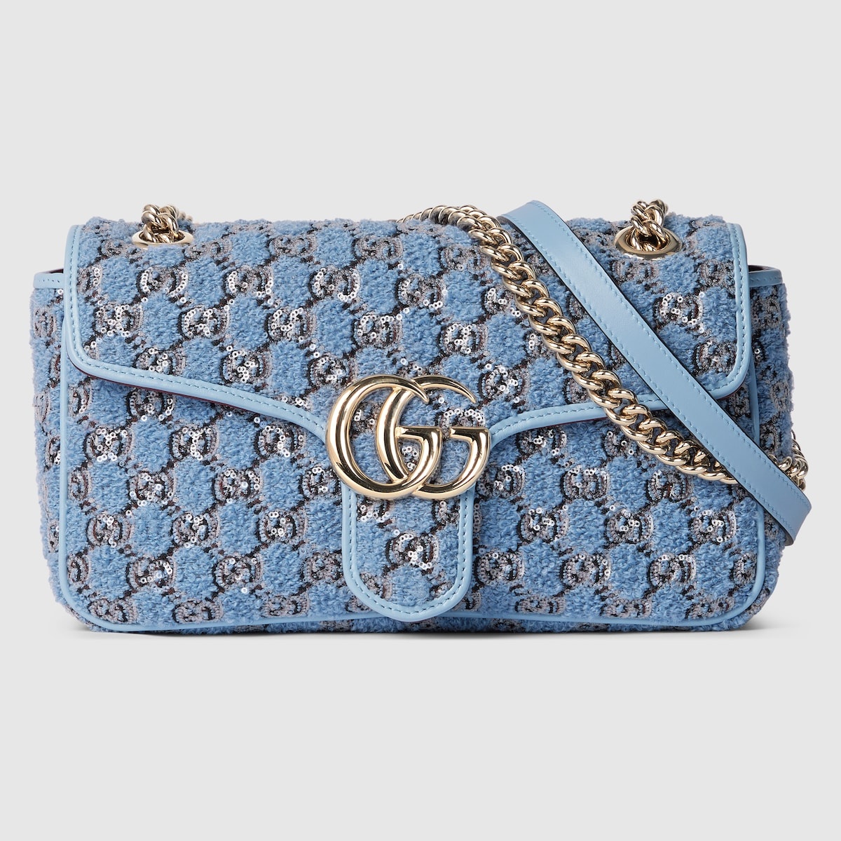 The GG Marmont collection presents cozy materials in sophisticated styles to welcome Pre-Fall. Crafted in GG boucle tweed with optical effect, this small shoulder bag offers a fresh visual dynamism, and can transition effortlessly from daytime to nighttime ensembles. The hardware is in light gold tone, which contrasts elegantly with the blue design and Rosso Ancora lining. - Blue GG boucle tweed with optical effect - Blue leather trim - Light gold-toned hardware - Rosso Ancora cotton linen lining - Double G - Interior zipper pocket - Sliding chain strap can be worn as a shoulder strap with 21.6" drop or can be worn as a top handle with 11.8" drop. - Flap with spring closure - Small: 10"W x 6"H x 3"D - Weight: 1.42lbs approximately - Made in Italy - Fits up to: iPhone Pro Max/Plus, Airpods, long wallet, and lipstick