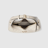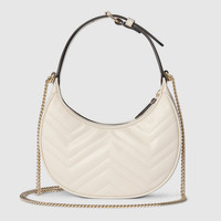 With a crescent silhouette and textured white leather, this small bag has a defined retro feel. Each collection is a journey through different decades and eras, combining vintage elements with archival codes or contemporary details to create new designs that exist outside of space and time. The small accessory reflects this fascination with the past, a concept that runs throughout the world of GG Marmont. - White matelasse chevron leather - Antique gold-toned hardware - Moire and microfiber lining with suede-like finish - Double G - Inside: 2 card slots and 1 hook - Adjustable handle with 6.3" drop - Chain shoulder strap with 23.6" drop - Zip closure - Weight: 395gr. approximately - 8.5"W x 4.3"H x 2"D - Made in Italy - Fits up to iPhone Pro Max/Plus, small wallet, and lipstick