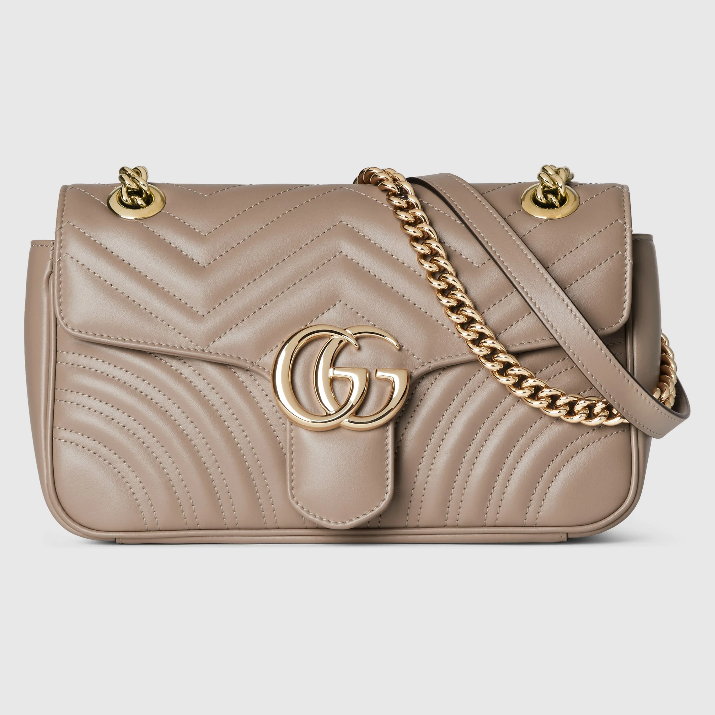 Embellished with the archival Double G logo, first introduced in the 1970s, the GG Marmont bag has established itself as a signature style of the House. The two capital letters of the style’s name refer to this emblem, recognizable by the partially overlapping hardware on the handbag’s front. Crafted from soft matelasse leather, the elegant handbag is evocative of Florentine craftsmanship. - Taupe matelasse chevron leather - Light gold-toned hardware - Brown cotton linen lining - Double G - Interior zipper pocket - Sliding chain strap can be worn as a shoulder strap with 21.6" drop or can be worn as a top handle with 11.8" drop. - Flap with spring closure - Small: 10"W x 6"H x 3"D - Weight: 1.42lbs approximately - Made in Italy - Fits iPhone Pro Max/Plus, Airpods, long wallet, and lipstick