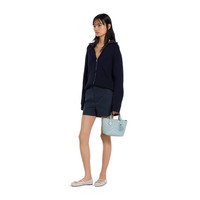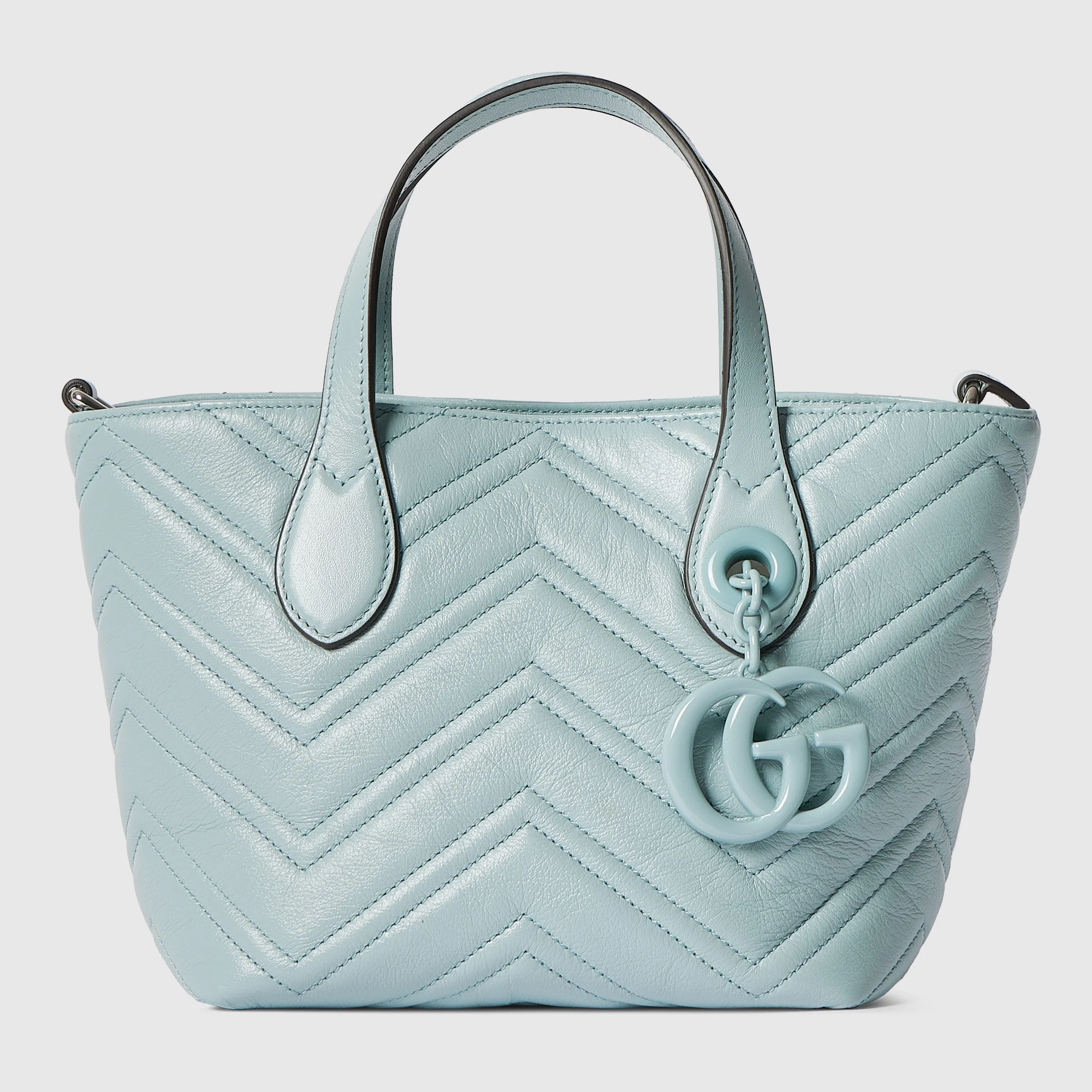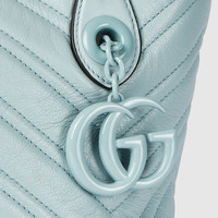 The GG Marmont, a signature collection of the House, features the Double G hardware and soft construction in an exceptionally supple leather. This design highlights the emblematic hardware as a bag charm, and can change from a structured tote to soft-shaped bucket for versatility. - Icy blue matelasse chevron nappa leather - Tonal enameled hardware - Light blue viscose lining - Double G - Handle drop: 3.9" - Detachable leather strap drop: 20.9"; Length: 39.8" - Magnetic closure - 6.9"W x 6.7"H x 4.9"D - Weight: 0.8lbs approximately - Fits iPhone Pro Max/Plus, Airpods, small wallet, and lipstick
