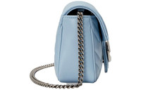 This GG Marmont bag is defined by its super mini shape, softly structured feel and a simple flap closure. The now recognizable Double G defines the line–a three-dimensional detail inspired by an archival design from the '70s. Made in matelassé leather with a chevron design, pastels push the color focus throughout the Pre-Fall 2020 collection, in soft, vibrant hues. - Pastel blue matelassé chevron leather with heart - Antique palladium-toned hardware - Microfiber lining with a suede-like finish - Attached key ring that can attach to a separate bag - Double G - Chain shoulder strap with 23.5" drop - This item can fit a cell phone up to 2.7”W x 5.8”H x .3”D - The Gucci card case wallet will fit inside this product - Weight: .35kg approximately - Super mini size: 6.5"W x 4"H x 2"D - Made in Italy