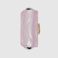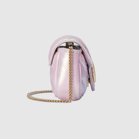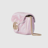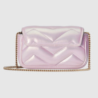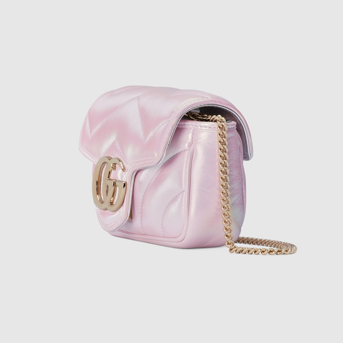 The Double G hardware brings the past into the House's present with the notion that a cherished wardrobe is enriched by items that can be worn season after season. This super mini bag with a chain strap is crafted from iridescent matelassé chevron leather in light pink. - Pink iridescent matelassé chevron leather - Gold-toned hardware - Silk satin lining - Attached key ring that can attach to a separate bag - Double G - Chain shoulder strap with 23.6" drop - Weight: 12.4 oz approximately - Super mini size: 6.2"W x 4"H x 1.7"D - Made in Italy - Fits up to iPhone Pro, card case, and lipstick