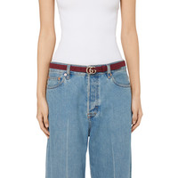 This bold GG Marmont belt is presented as part of the Pre-Fall 2025 collection. Taking inspiration from the heritage of the House, it's crafted from a GG canvas and defined by a light gold-toned Double G buckle. - Gucci Rosso Ancora red GG canvas - Gucci Rosso Ancora red leather trim - Light gold-toned hardware - Double G buckle - Buckle: 2.36"W x 1.85"H - 0.8" belt width - Made in Italy - Can be worn as a hip or waist belt. Sizing will differ based on where the belt is worn, please refer to the size guide to find your size.