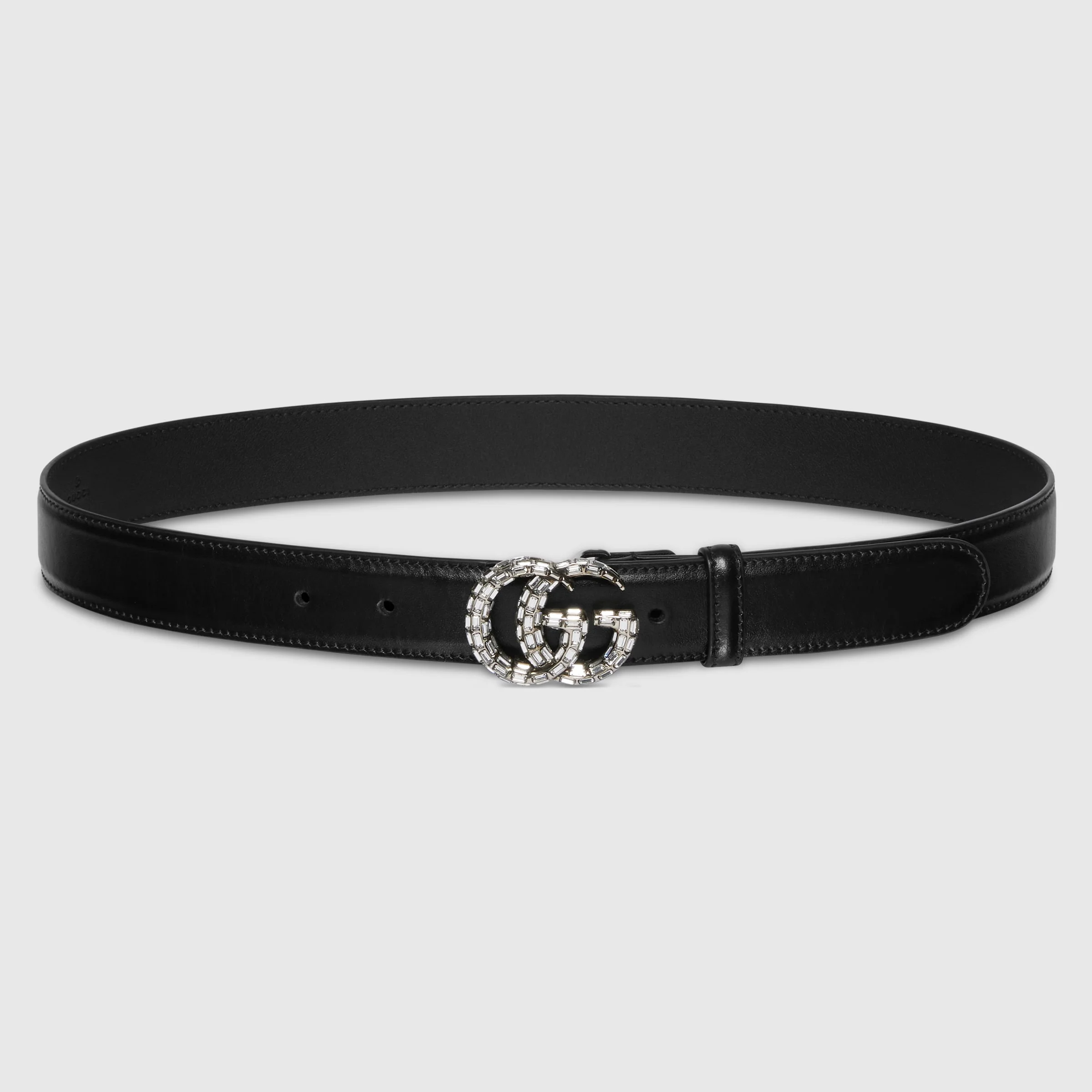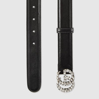 Materials and motifs are mixed together to create unique iterations of signature styles. The House's emblematic monogram buckle is set with crystals on this black leather belt. - Black leather - Palladium-toned hardware - Crystal Double G buckle - 1.2" width - Made in Italy - Can be worn as a hip or waist belt. Sizing will differ based on where the belt is worn, please refer to the size guide to find your size.