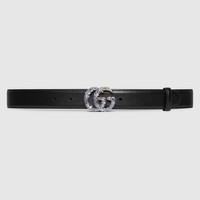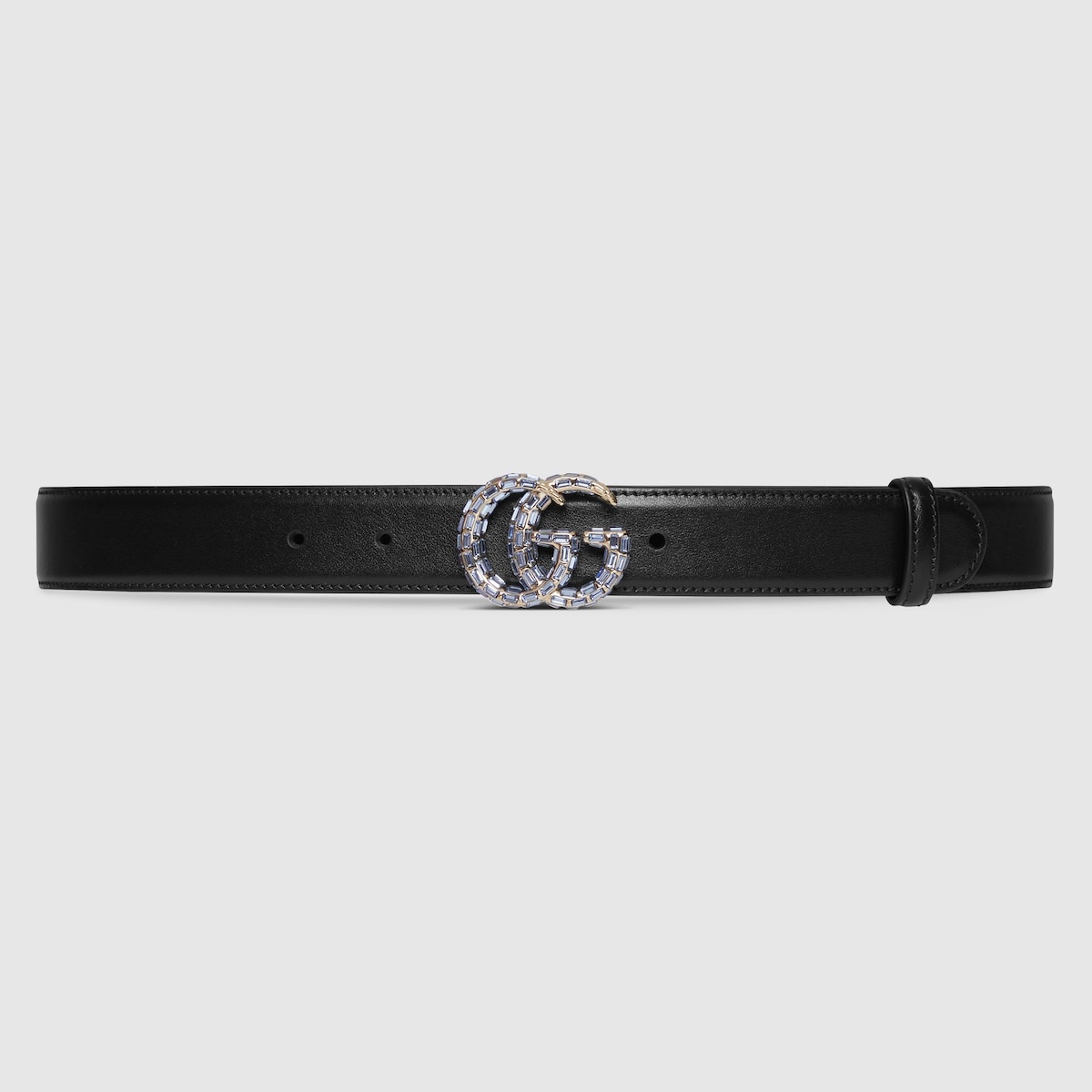 For the Cruise 2025 collection, GG Marmont belts are reinterpreted in new ways with a contemporary touch. The House's emblematic monogram buckle is set with crystals on this dark blue leather belt. - Dark blue leather - Light gold-toned hardware - Crystal Double G buckle - 1.2" width - Made in Italy - Can be worn as a hip or waist belt. Sizing will differ based on where the belt is worn, please refer to the size guide to find your size.