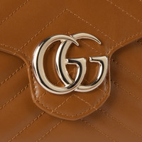 The GG Marmont wallet on chain is presented in matelasse leather. The style is completed with the line's signature Double G hardware. - Brown matelasse chevron leather - Light gold-toned hardware - Brown taffeta lining - Double G - Inside: 6 card slots, 1 zipper pocket and 1 flap pocket - Chain shoulder strap with 23.6" drop - Magnetic snap closure - 7.8"W x 4.7"H x 1.5"D - Weight: 0.7", approximately - Fits up to iPhone Pro, card case, and lipstick