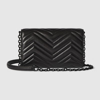 The GG Marmont, a signature collection of the House, highlights this wallet with chain crafted in exceptionally supple leather. The Double G hardware completes the piece with a tonal enamel finish. - Black matelasse chevron nappa leather - Tonal enamel hardware - Black taffeta lining - Double G - Inside: 6 card slots, 1 bill pocket, 1 zipper coin pocket, 1 open compartment - Leather and chain shoulder strap with 22.4" drop - Magnetic snap button closure - 7.8"W x 4.7"H x 1.5"D - Weight: 0.7lbs, approximately - Fits up to iPhone Pro, card case, and lipstick