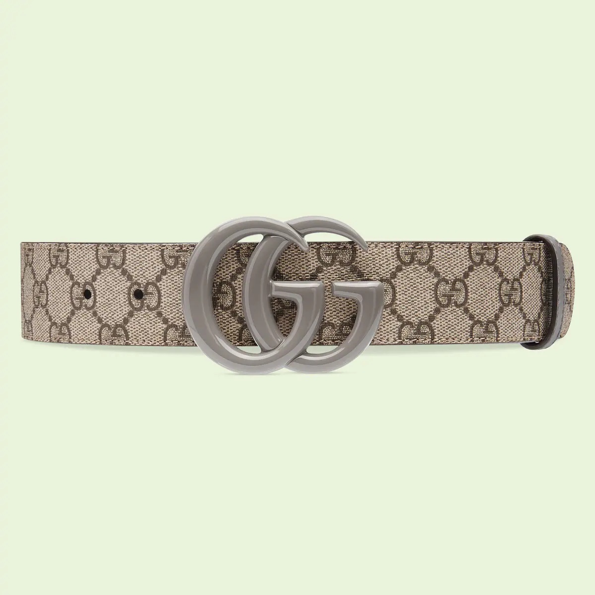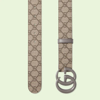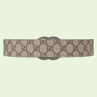 Link to the Beloved handbag line through the Double G, this wide belt is defined by its monogram hardware. Now a recognizable Gucci symbol, the accessory is presented in GG Supreme canvas on one side and grey leather on the other. - Beige and ebony GG Supreme canvas, on one side, grey leather on the other - Grey leather - Grey brass hardware with ceramic effect finishing - Double G buckle - Buckle: 3"W x 2.4"H - 1.5" belt width - Made in Italy