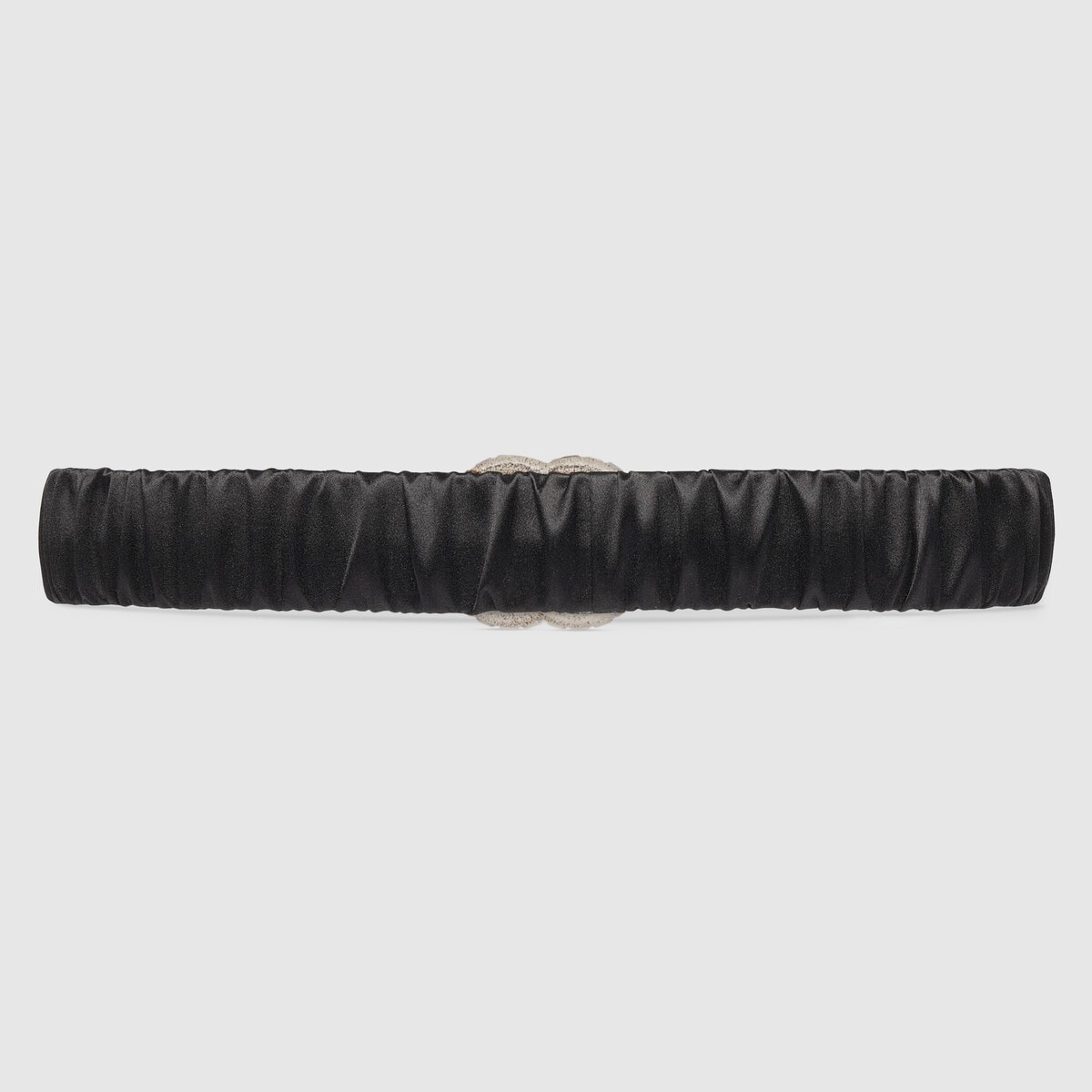 Materials and motifs are mixed together to create unique iterations of signature styles. The House's emblematic monogram buckle is set with crystals on this black gathered silk satin elastic belt. - Black gathered silk satin - Silver-toned hardware - Crystal Double G buckle - Width: 1.6" - Made in Italy - Can be worn as a waist belt. Sizing will differ based on where the belt is worn, please refer to the size guide to find your size.