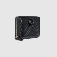 The GG Marmont, a signature collection of the House, highlights this zip around wallet silhouette crafted in exceptionally supple leather. The Double G hardware completes the piece with a light gold-toned finish. - Black matelasse chevron leather - Light gold-toned hardware - Black taffeta lining - Double G - 12 card slots and three bill compartments - Zip coin pocket - Zip around closure - 7.4"W x 4"H x .7"D - Weight: 0.4lbs, approximately - Made in Italy