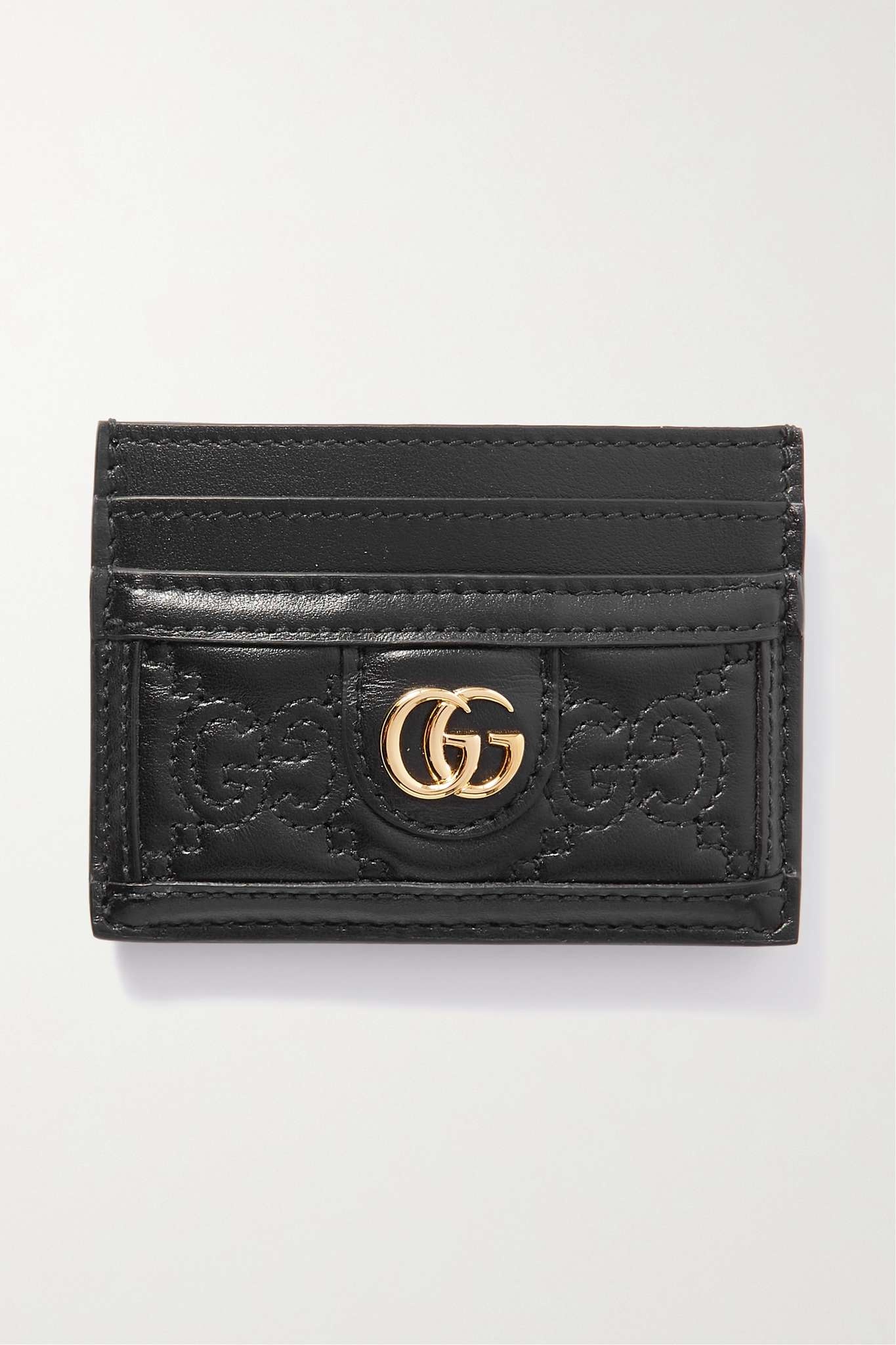 EDITORS'NOTES Look closely at Gucci's cardholder and you'll notice it's stitched with a graphic version of the brand's monogram. Crafted in Italy from supple leather and embellished with a gold-tone logo plaque, it's fitted with four card slots and a central compartment for storing bills and receipts. SIZE & FIT This item’s measurements are: - Length: 7.5cm / 3in - Width: 10cm / 3.9in DETAILS & CARE - Black leather (Calf) - Comes with dust bag