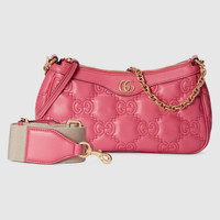 Matelassé leather is a signature material of the House, thanks to its super soft finish. The textured GG motif defines a selection of handbags, including this pink leather bag. The Double G hardware decorates the front, continuing the logo feel of the design. - Pink GG Matelassé leather - Pink leather trim - Gold-toned hardware - Cotton linen lining - Two detachable straps: canvas and chain - Double G - Canvas strap with 19.7" drop - Chain shoulder strap with 7.9" drop - Zip closure - 9.8"W x 6"H x 3.1"D - Made in Italy