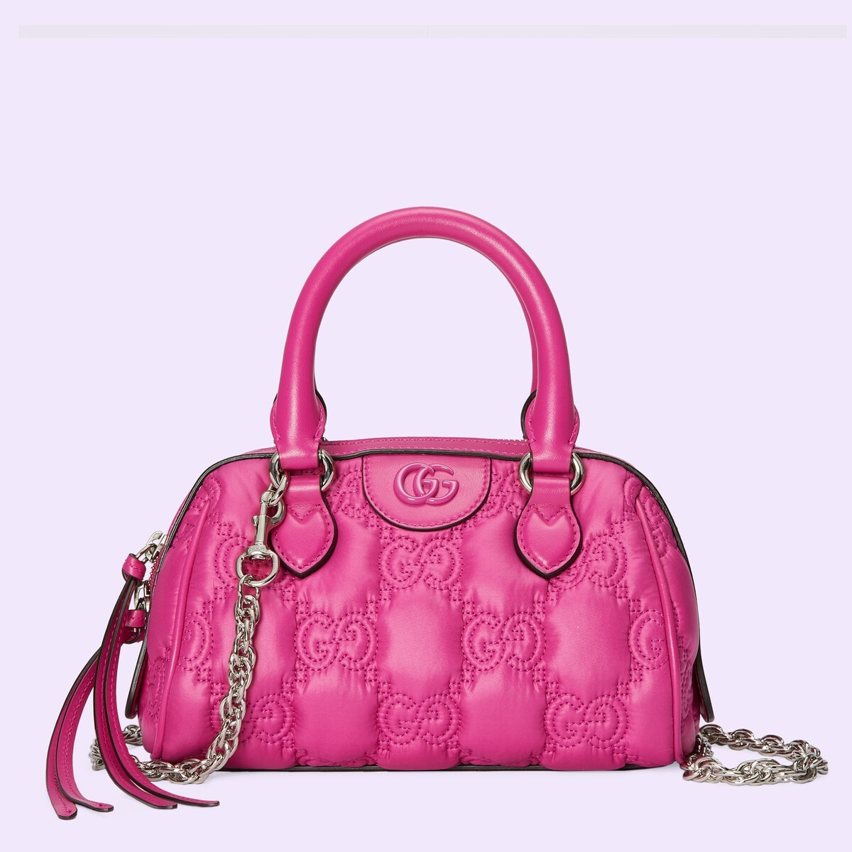 Accessories crafted from nylon come to the fore in new and unique ways. With a super soft finish, the signature material is reimagined with a textured geometric motif. The design presents a contemporary approach to the '90s logo trend that appears throughout the House's latest collections. This shoulder bag is presented in a vibrant shade of fuchsia with three interchangeable straps. - Fuchsia GG Matelassé nylon with fuchsia leather trim - Fuchsia brass hardware with ceramic effect finishing - Moiré lining - Double G - This style is sold with an additional shoulder strap which can be attached to the bag with a buckle closure - Chain shoulder strap: 19.7" drop; Nylon strap: 21.4" drop - Zip closure - 7.5"W x 5.1"H x 4.3"D - Made in Italy