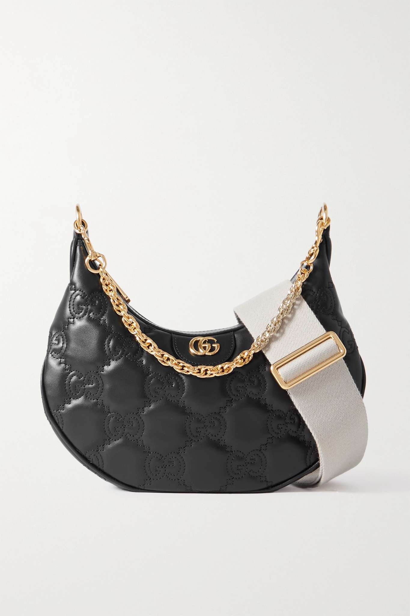 EDITORS'NOTES From the curved shape to the 'GG' matelassé finish, Gucci's bag pays homage to trendy styles from the '90s. It's made from smooth leather and has just enough space inside for the essentials. Switch between the gold-tone chain strap or contrasting canvas one. SIZE & FIT This item’s measurements are: - Min. Strap Length: 84cm / 33.1in - Depth: 7cm / 2.8in - Max. Strap Length: 134cm / 52.8in - Height: 22cm / 8.7in - Width: 26cm / 10.2in DETAILS & CARE - Black leather - Zip fastening along top - Comes with dust bag