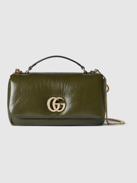 The GG Milano top handle bag by Creative Director Sabato De Sarno debuted at the Fall Winter 2024 fashion show during Milan Fashion Week, paying tribute to the city which inspired the design. It features a new Double G hardware, and the puffy leather has a soft and silky touch. The chain strap allows the bag to be worn crossybody or on the shoulder. - Dark olive green puffy leather - Shiny light gold-toned hardware - 2 D-rings at the base of the top handle, for detachable items - Dark olive green leather lining - Double G - 1 zip pocket with GG charm, 1 open pocket and 1 lipstick holder compartment - Top handle with 2.4" drop - Detachable shoulder chain strap with 19.3" drop - Spring closure - Weight: 1.4lbs, approximately - Small: 10.2"W x 5.5"H x 2.4"D
