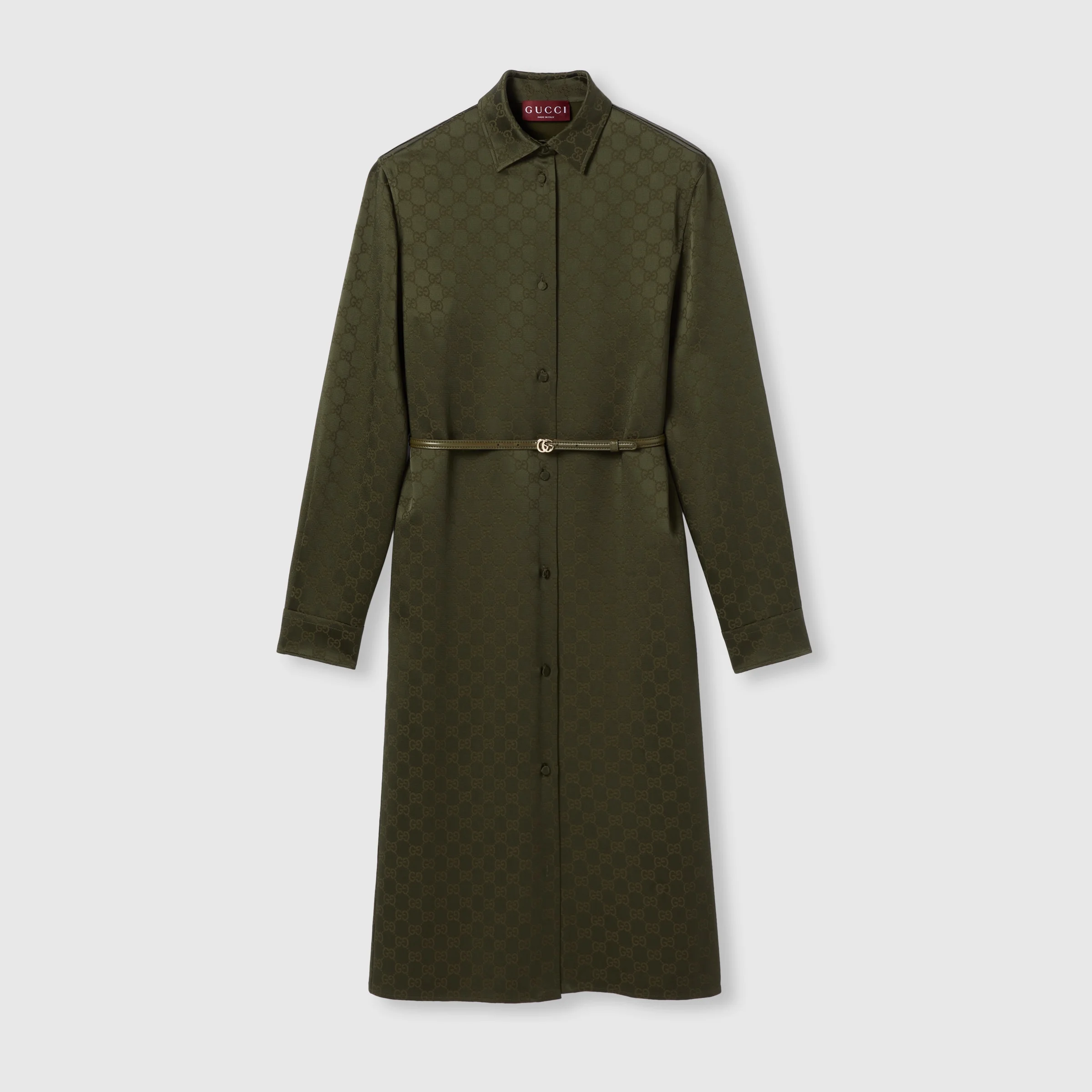 Green defines the color narrative for Pre-Fall 2025 and speaks volume with textures, logo details and varying tonalities, as seen on the runway. This shirt dress in the distinctive hue, appears in GG satin and is complete with a leather Double G belt. - Forest green GG satin - Self-covered buttons - Unlined - Point collar - Long sleeves - Detachable leather belt with Double G buckle - Button closure - Made in Italy