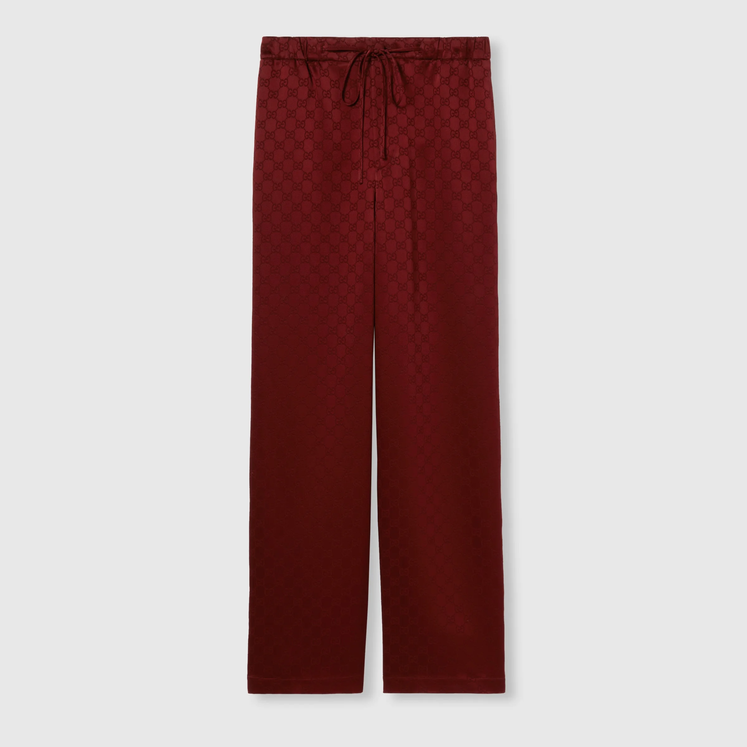 From light to deep shades, elegant pieces crafted from refined materials highlight sensual silhouettes, elevating the Pre-fall 2025 collection. This pair of casual pants are made from a delicate GG satin. - Gucci Rosso Ancora red GG satin - Blue piping - Unlined - Elastic waist with drawstring - Two side pockets - Two back pockets - Made in Italy