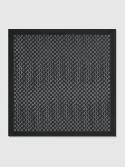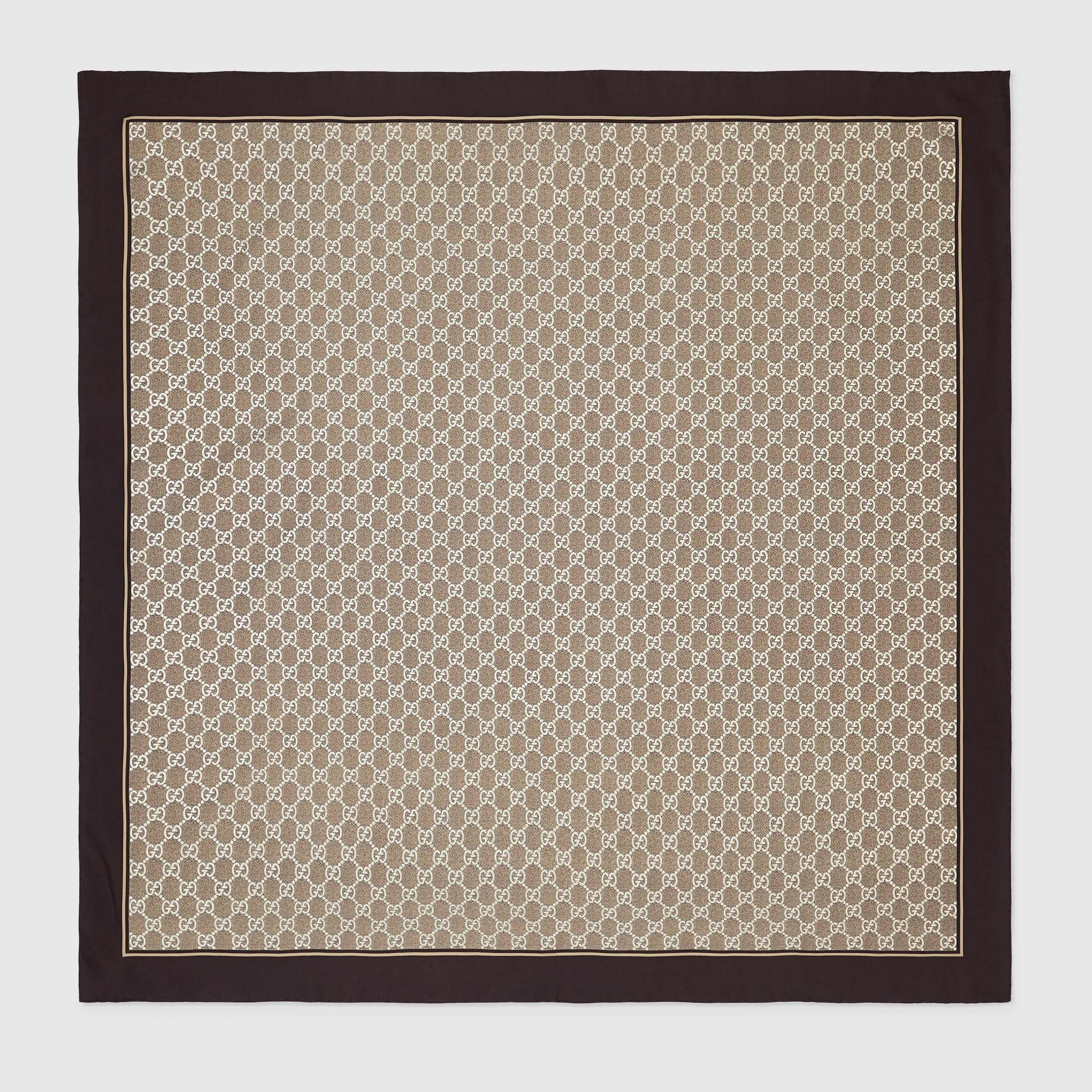 A signature symbol of the House, the GG monogram is displayed atop a selection of silk accessories in a delicate color palette. Crafted from camel silk, this carre is defined by a laminated GG motif. - Camel silk - Lame GG print - Dark brown trim - 27.5"W x 27.5"H - Made in Italy - The dimensions of this item may vary slightly as the hem is hand-sewn