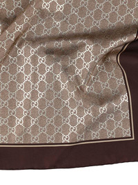 DETAILS - Height: 70cm Width: 70cm - Camel silk - Lame GG print - Dark brown trim - Made in Italy - Composition: 100% Silk
