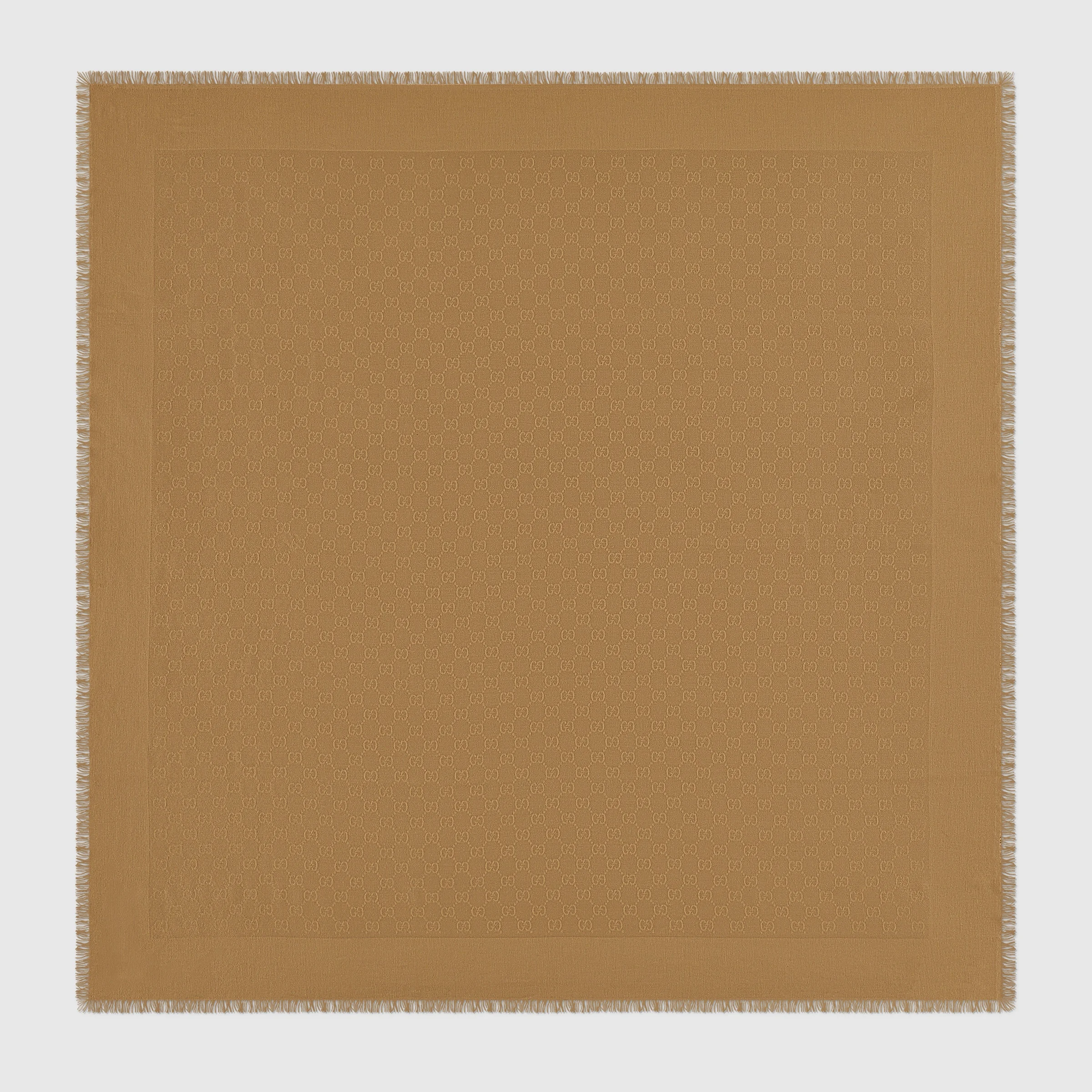 The Pre-Fall 2025 collection presents the GG motif across a wide selection of silk accessories that can be layered. Crafted from a GG cotton silk jacquard, this soft shawl is completed with a fringe trim. - Beige GG cotton silk jacquard - Fringe trim - 49.2"W x 49.2"L - Made in Italy