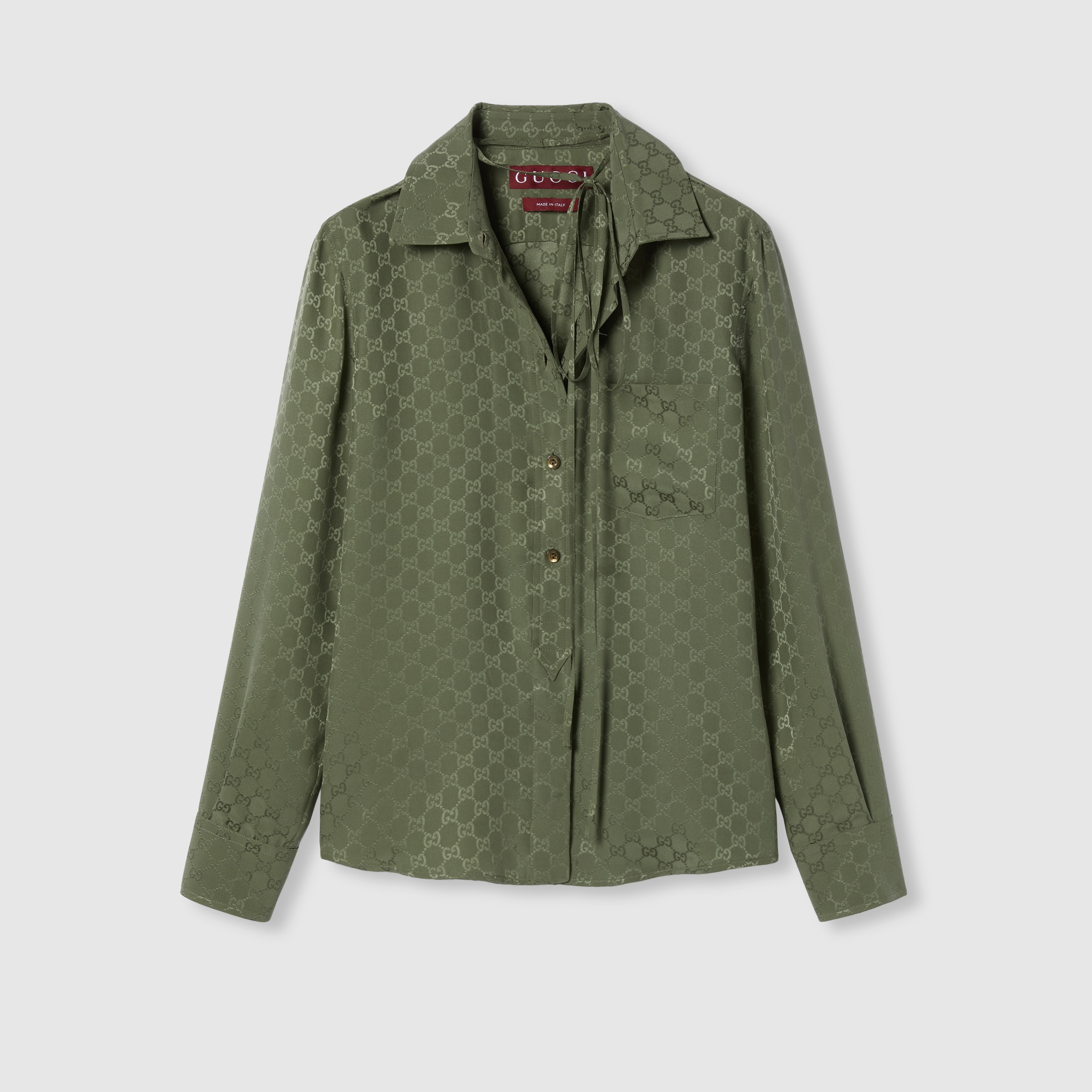 The Pre-Fall 2025 collection perfectly blends versatile textures and sophisticated detailing. Jacquard weavings and intricate embroideries evolve to reflect the changing seasons. This shirt is crafted from a refined GG silk jacquard and features a self-tie ribbon at the collar. - Dark green GG silk jacquard - Unlined - Point collar with self-tie ribbon - Breast pocket - Button closure - Made in Italy