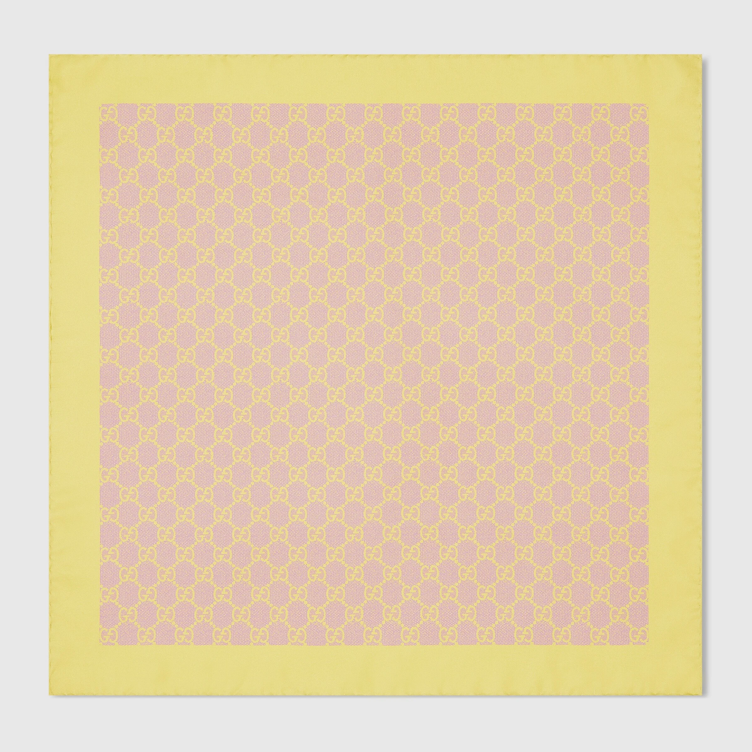 The House's silk accessories collection continues to reinterpret emblematic motifs, from the GG, Web, Flora, bamboo, Horsebit and equestrian inspirations, in sumptuous materials, intricate craftsmanship, and fresh hues. This playful bandana is presented in GG silk twill. - Pink and yellow GG silk twill - 19.6"W x 19.6"L - Main fabric: silk 100%