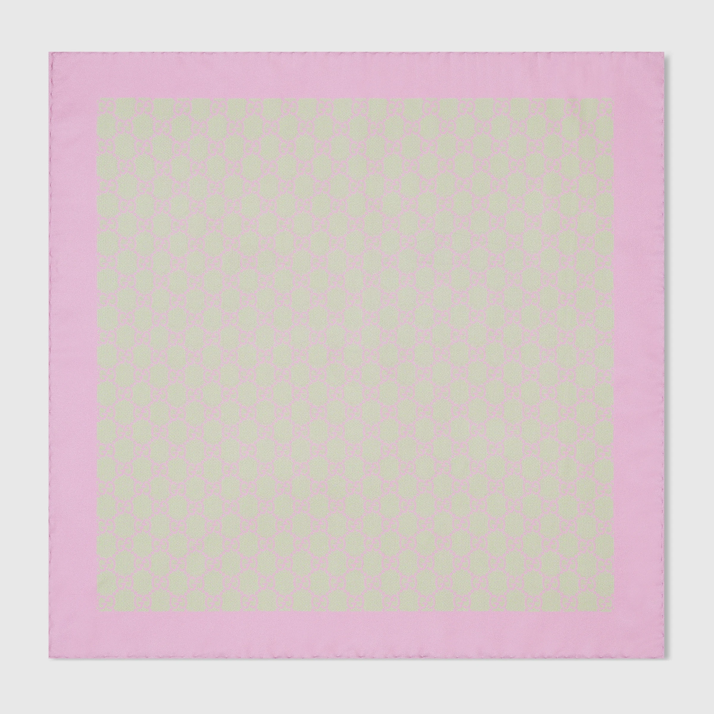 The House's silk accessories collection continues to reinterpret emblematic motifs, from the GG, Web, Flora, bamboo, Horsebit and equestrian inspirations, in sumptuous materials, intricate craftsmanship, and fresh hues. This playful bandana is presented in GG silk twill. - Acquamarine and pink GG silk twill - 19.6"W x 19.6"L - Main fabric: silk 100%