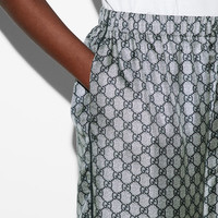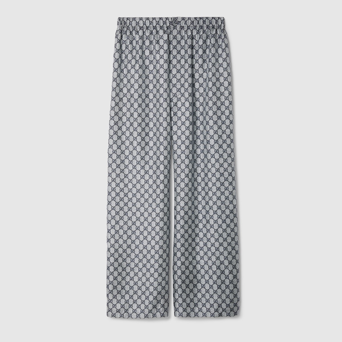 Inspired by the summer spirit and beach clubs on the Italian coast, this item is part of Gucci Lido. For the Pre-Fall collection, essential pieces are embellished with signature Gucci motifs for the wardrobe. This pair of pants is presented in GG printed silk with a tonal piped trim, speaking volumes about stylish comfort. - GG print blue and white silk twill - Blue piping detail - Unlined - Elastic waistband - Button closure - Length: 40.9", based on a size 40 (IT) - Leg opening: 11.8", based on a size 40 (IT) - Made in Italy - The product shown in this image is a size 40 (IT)