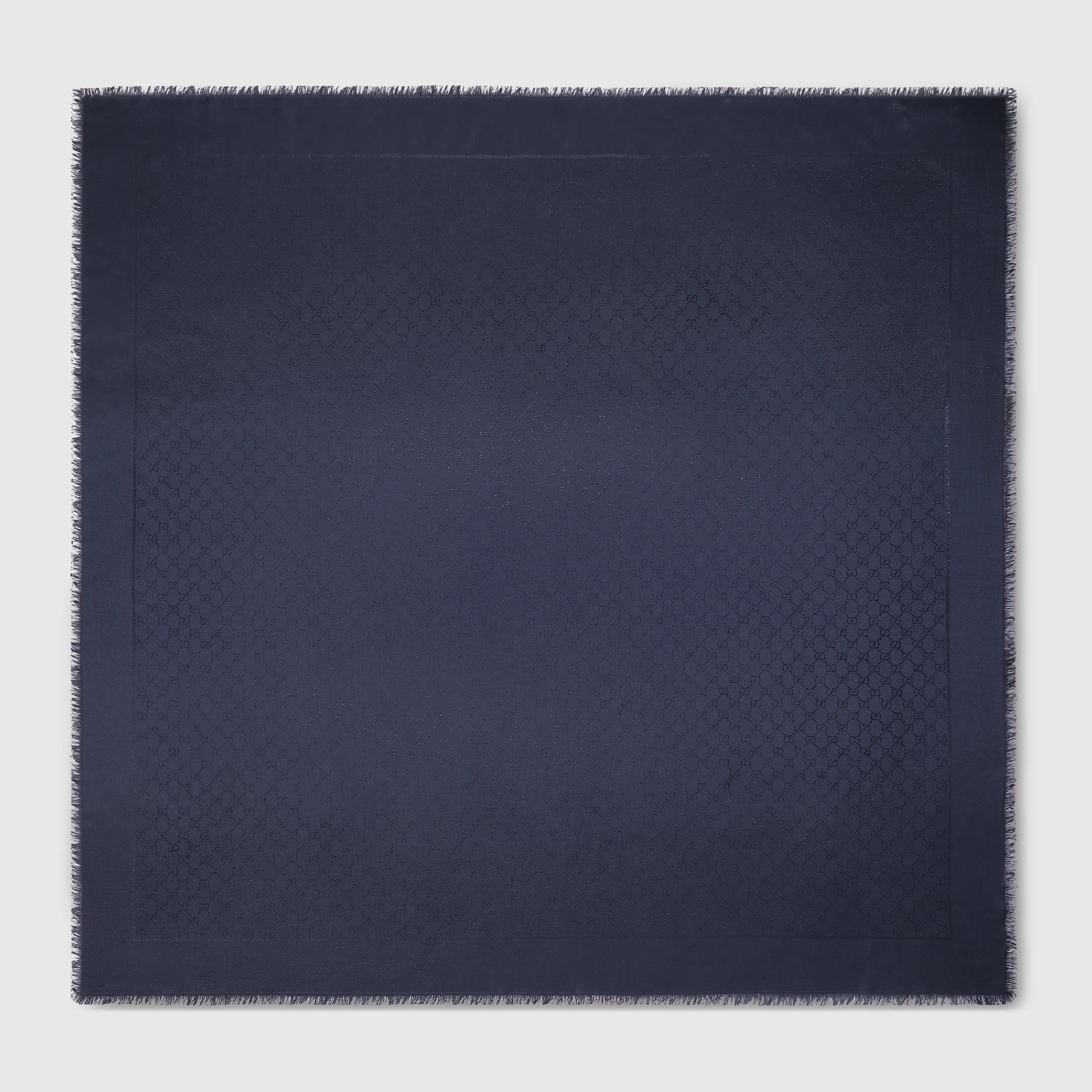 The House's silk accessories collection continues to reinterpret emblematic motifs, from the GG, Web, Flora, bamboo, Horsebit and equestrian inspirations, in sumptuous materials, intricate craftsmanship, and fresh hues. This shawl is presented in GG silk wool lame and decorated with a fringe trim. - Dark blue GG silk wool lame - Fringe trim - 51.1"W x 51.1"L - Main fabric: silk 66%, wool 24%, metallised fiber 10%