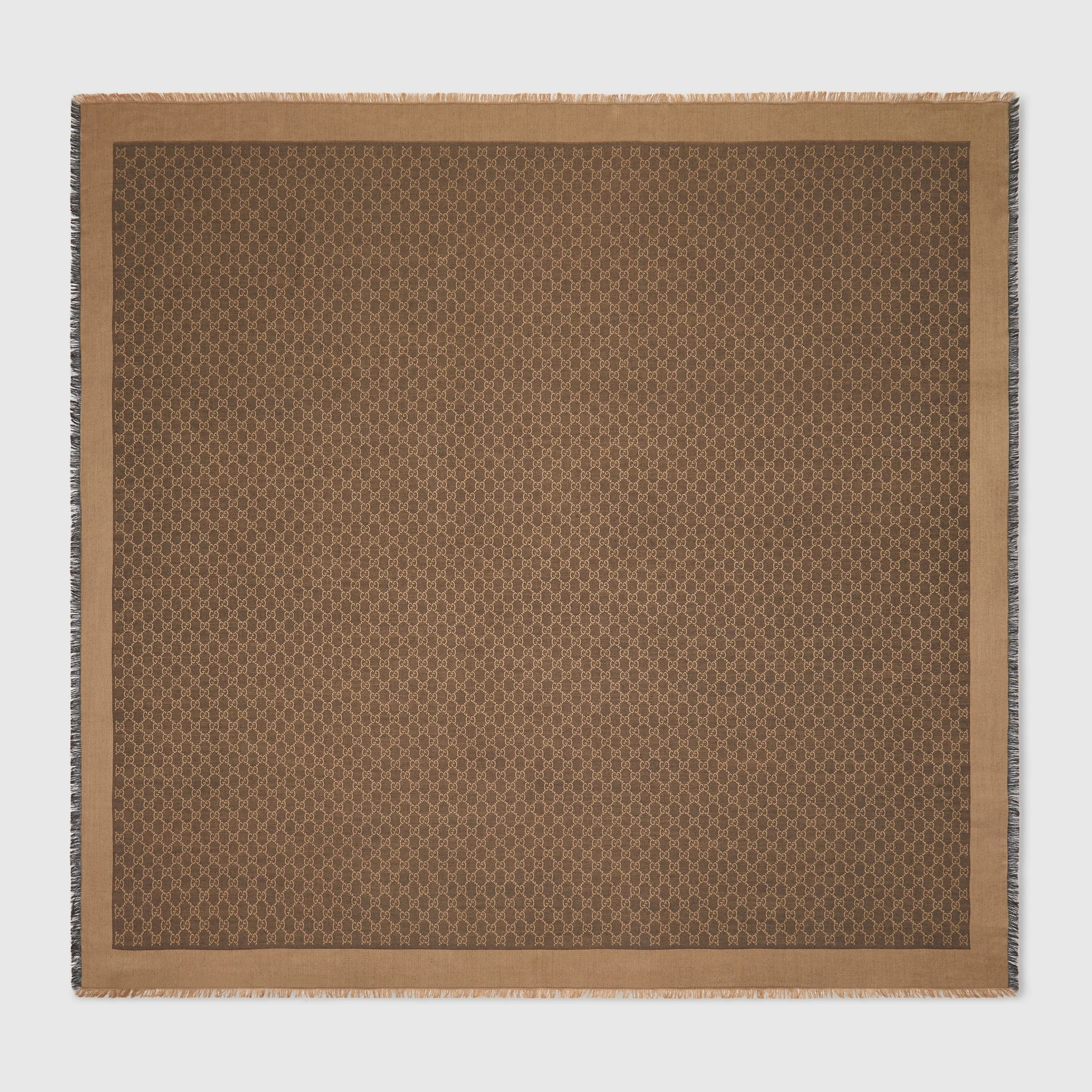 The House's silk accessories collection continues to reinterpret emblematic motifs, from the GG, Web, Flora, bamboo, Horsebit and equestrian inspirations, in sumptuous materials, intricate craftsmanship, and fresh hues. Crafted from a GG silk wool, this soft shawl has been finished with a delicate fringe trim. - Brown and beige GG silk wool - Fringe trim - 51.1"W x 51.1"L - Main fabric: silk 60%, wool 40%