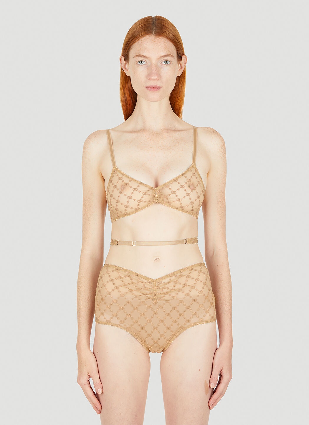 - Technical fabrication in a tulle weave - Adjustable shoulder straps - Rear hook-and-eye fastening - Wraparound underband - All-over logo embroidery - Picot trims - High rise - Elasticated waistband with front ruching - Mid coverage at rear - Made in Italy - 84% Polyamide, 16% Elastane. Machine wash cold - Color: Beige - Code: 695771 XUAEB 6851