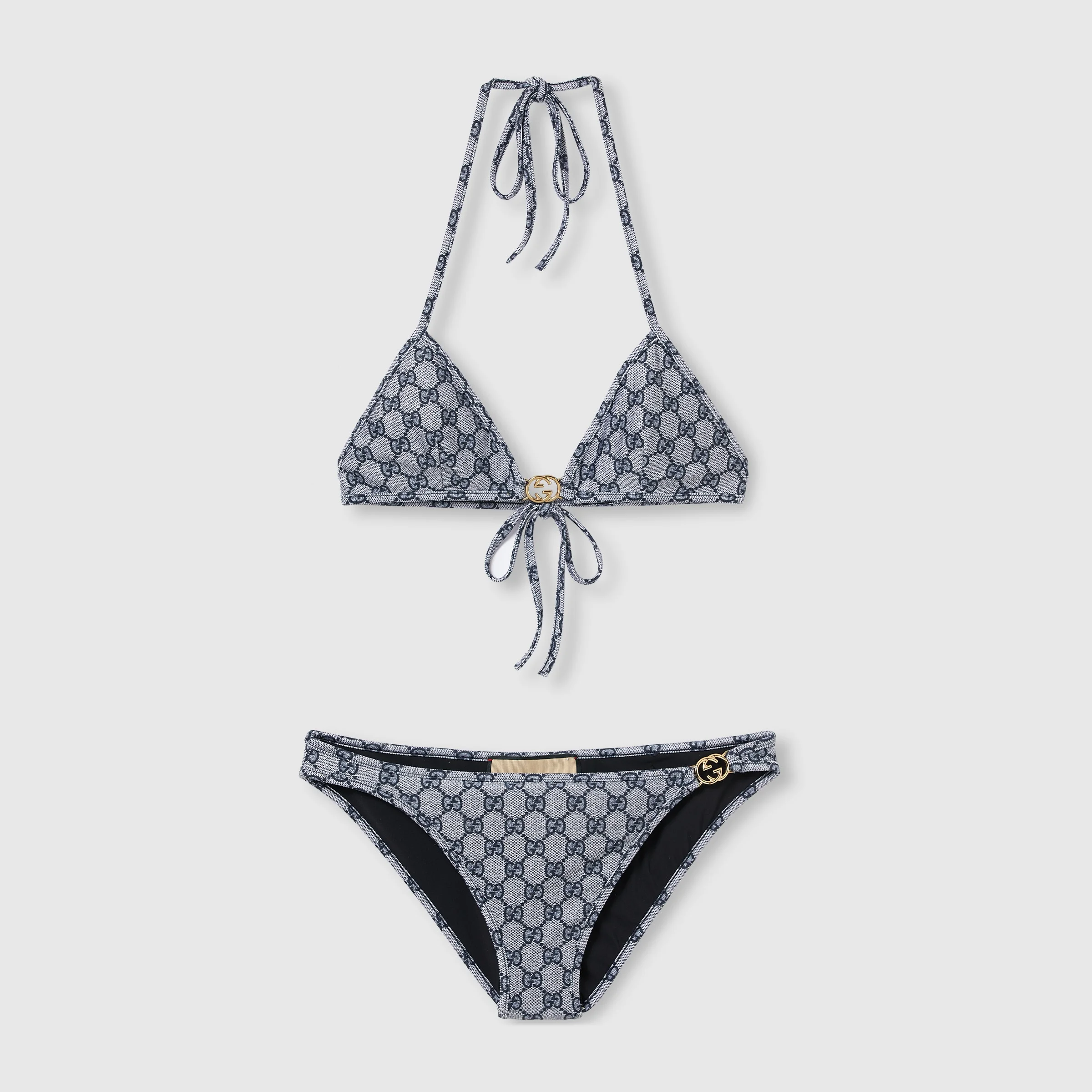 Inspired by the summer spirit and beach clubs on the Italian coast, this item is part of Gucci Lido. Emblematic codes of the House and refined patterns are reinterpreted in contemporary ways for the Pre-Fall collection. Here, the Interlocking G is paired with a sparkling G jersey monogram, mixing two historic motifs across a contemporary style. - Blue and white GG stretch jersey - Interlocking G detail - Please note that intimates, including swimwear, tights, socks and lingerie can only be returned in new condition. Items should be unworn, in their original packaging and with all labels attached. - Laces that tie at the back and at the neck - Made in Italy