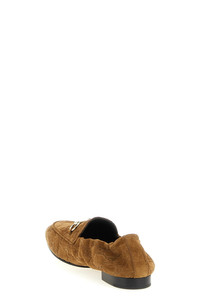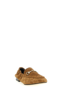 cod. 854414AADWE2118 Suede loafers with embossed GG pattern, front metal clamp, elastic back, leather sole. Color: Brown Size & Fit: EU WOMEN Composition: 100% calfskin leather (Bos Taurus) Made in: Italy