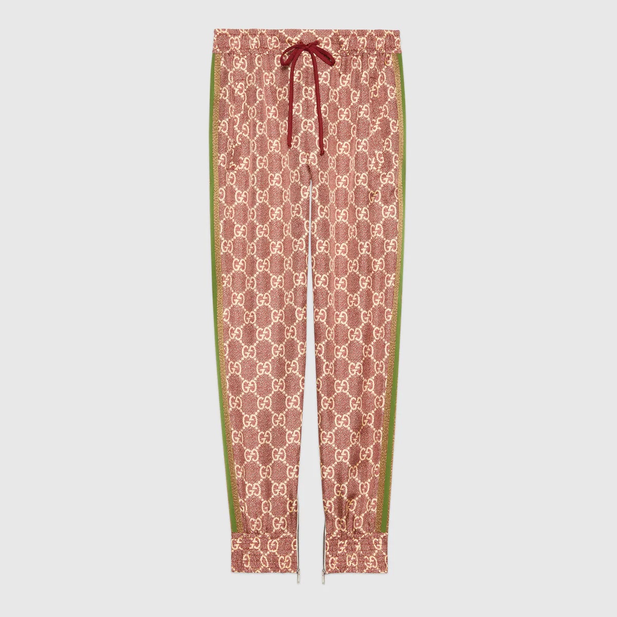The GG Supreme pattern gets reinterpreted into ready-to-wear silhouettes crafted from refined fabrics, for an unexpected take on activewear. Here, the emblematic motif animates a silk twill pant enhanced by colorful lamé stripes down the sides. The elastic waistband adds a sporty feel. - Pink and beige GG Supreme print organic silk twill - Green, red and gold lamé stripe down the sides - This product contains organic silk where the sericulture and manufacturing process restrict the use of chemicals, eliminate pesticides or artificial fertilizers and incorporate methods that respect biodiversity, improve soil quality, and reduce water consumption. - Elastic waistband with drawstring - Front pockets - Elastic detail and zip at the leg opening - Made in Italy