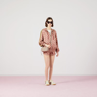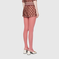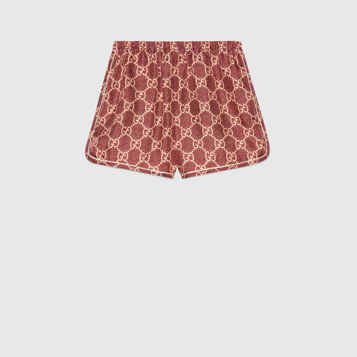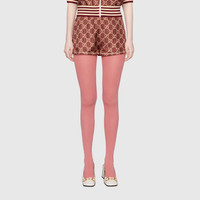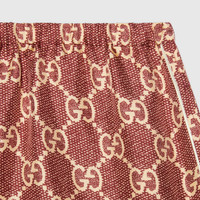 The GG Supreme pattern gets reinterpreted into ready-to-wear silhouettes crafted from refined fabrics, for an unexpected take on activewear. Here, the emblematic motif animates silk twill shorts enhanced by colorful lamé stripes down the sides. The elastic waistband adds a sporty feel. - Pink and beige GG Supreme print organic silk twill - Green, red and gold lamé stripe down the sides - This product contains organic silk where the sericulture and manufacturing process restrict the use of chemicals, eliminate pesticides or artificial fertilizers and incorporate methods that respect biodiversity, improve soil quality, and reduce water consumption. - Length 11.8" based on a size XS - Made in Italy - The product shown in this image is a size extra small