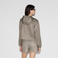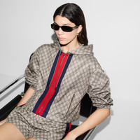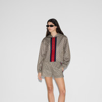 Inspired by the summer spirit and beach clubs on the Italian coast, this item is part of Gucci Lido. Tops and bottoms from jersey to denim and other materials open up numerous styling possibilities. This technical jersey jacket with a zip closure and drawstring hood sports a casual silhouette. A Web stripe and GG motif elevate the style with logo details. - Beige and ebony GG technical jersey - Blue and red Web central stripe - Lined - Fixed hood with drawstring - Two side zip pockets - Elastic cuffs - Zip closure - Length: 19.5" based on a size 40 (IT) - Made in Italy - The product shown in this image is a size 40 (IT)