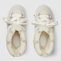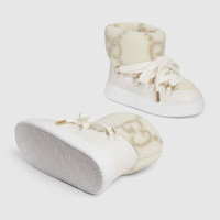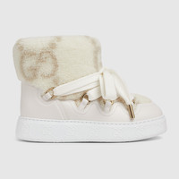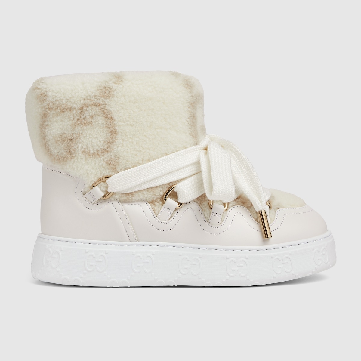 Emblematic House codes mix together and create unique designs. This boot is defined by the GG rubber sole. The result is an accessory that is perfect for colder temperatures. - Ivory GG merino wool-effect fabric - Women's - Light gold-toned hardware - Leather trim - GG rubber sole - Lace-up - Flat - Made in Italy