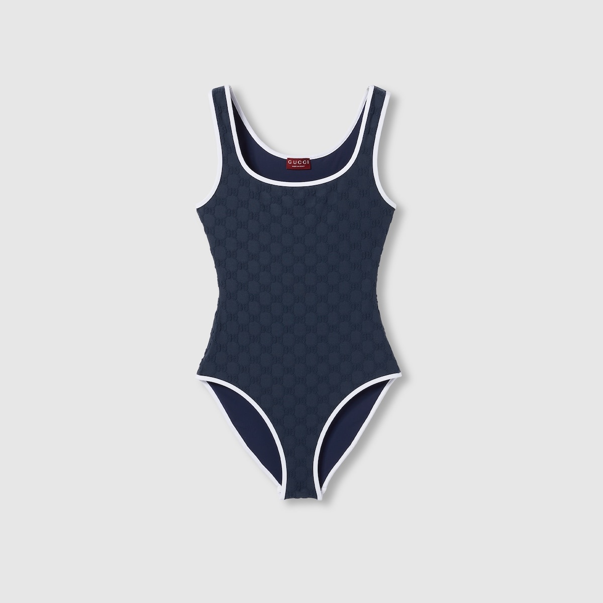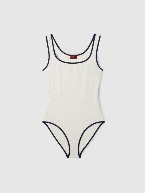 This streamlined swimsuit appears as part of the Cruise 2025 collection. Crafted from a GG terrycloth jersey, it's defined by a contrasting white trim. - Blue GG terrycloth jersey - White trim - Two shoulder straps - Scoop neck - High leg - Please note that intimates, including swimwear, tights, socks and lingerie can only be returned in new condition. Items should be unworn, in their original packaging and with all labels attached. - Made in Italy - The model is 5'9" and is wearing size small
