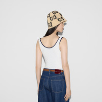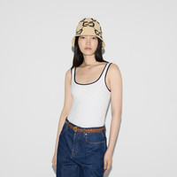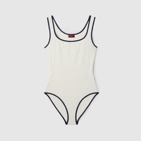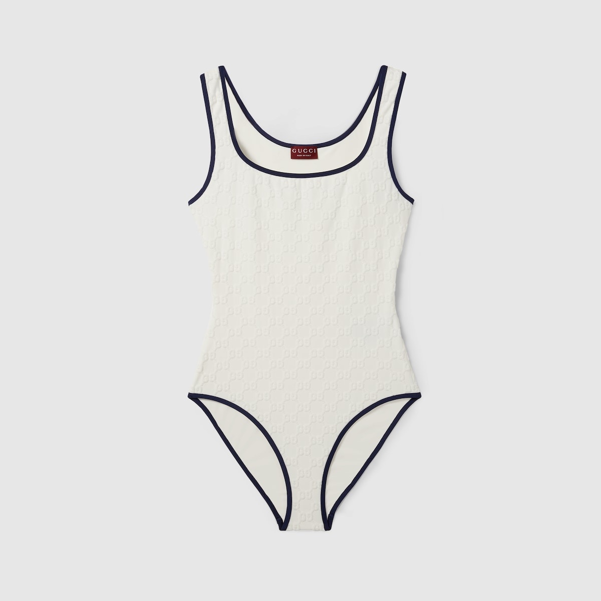 This streamlined swimsuit appears as part of the Cruise 2025 collection. Crafted from a GG terrycloth jersey, it's defined by a contrasting blue trim. - White GG terrycloth jersey - Blue trim - Lined - Two shoulder straps - Scoop neck - High leg - Please note that intimates, including swimwear, tights, socks and lingerie can only be returned in new condition. Items should be unworn, in their original packaging and with all labels attached. - Made in Italy - The model is 5'8" and is wearing size small