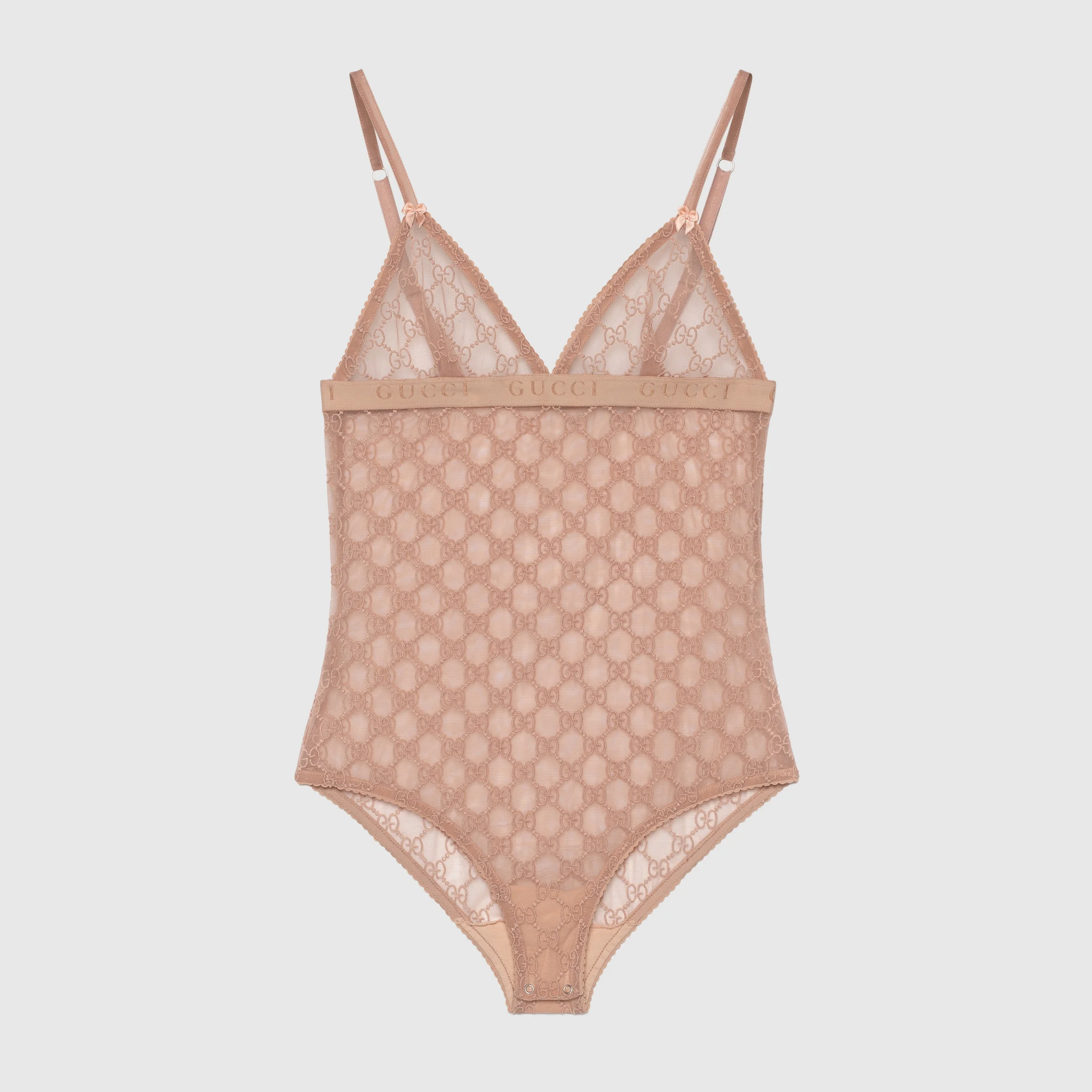 Diaphanous ready-to-wear pieces with lingerie inspired details walked the Cruise 2020 runway, immersed among Rome’s Capitoline Museums. Crafted from embroidered GG tulle in pale pink and completed with an elastic Gucci stripe, this bodysuit plays with soft shades and speaks to the spirit of freedom and self-determination woven through the collection’s looks. - Pale pink GG embroidered tulle - Light pink elastic Gucci stripe - This item is accompanied by a dedicated packaging featuring the name of the House and an ornate gold pattern that recalls vintage dressing tables. - Adjustable straps - Please note that intimates, including but not limited to swimwear, tights and lingerie are considered final sale and cannot be returned. . - Snap button closure - Made in Italy - The product shown in this image is a size small