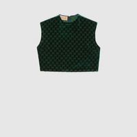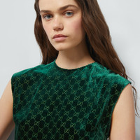 A blend of classic designs and unexpected details characterizes the Cruise 2024 collection. The House's historical monogram is presented here across a soft velvet base, bringing a contemporary twist to the streamlined silhouette. - Emerald green GG velvet - Crewneck - Sleeveless - Cropped - Zip closure - Length: 15.3" based on a size 40 (IT) - Made in Italy - The product shown in this image is a size 40 (IT)
