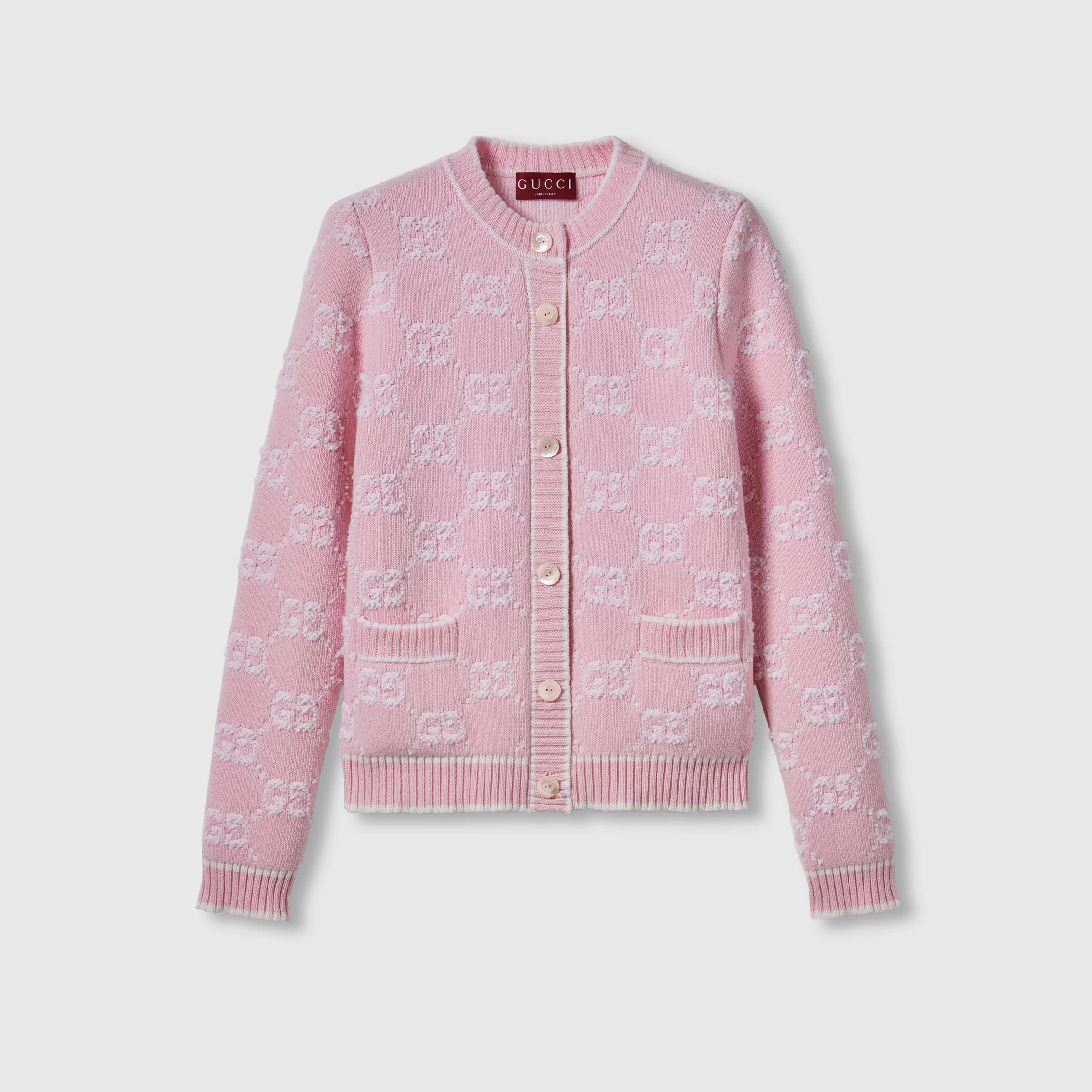 Taking inspiration from founder Guccio Gucci's monogram, the GG motif continues to be a firm favorite of the House. This crewneck cardigan is stated in soft wool GG boucle stitch jacquard and completed with a contrast rib trim. - Light pink and white soft wool GG boucle stitch jacquard - Crewneck - Long sleeves - Two front pockets - Rib trim - Button closure - Length: 21.3"; Shoulder: 13"; Half waist/chest: 18.1"; Sleeves length: 24.8" based on a size s - Made in Italy - The product shown in this image is a size small - Hem Width: 44cm