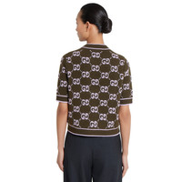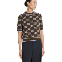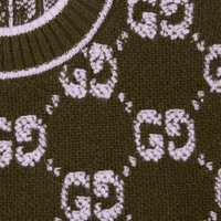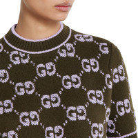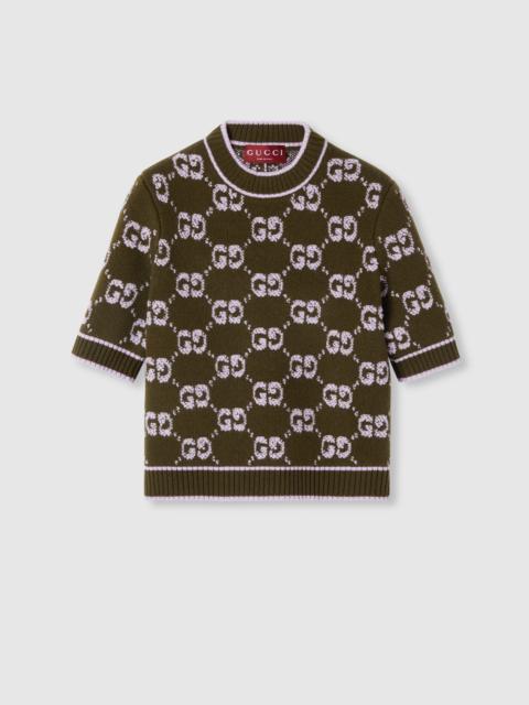 Taking inspiration from founder Guccio Gucci's monogram, the GG motif continues to be a firm favorite of the House. Green defines the color narrative for Pre-Fall 2025, this crewneck top is stated in soft wool GG boucle jacquard and completed with a contrast rib trim. - Forest green and lilac GG wool boucle jacquard - Crewneck - Short sleeves - Rib trim - Shoulder drop: 13.7 " based on a size S (IT) - Sleeves Length: 10.6 " based on a size S (IT) - Length: 20.1"; Shoulder: 13.8"; Half waist/chest: 18.5"; Sleeves length: 10.6" based on a size s - Made in Italy - Hem Width: 45cm - Fabric: 100% Wool - Trimming: 98% Wool, 1% Elastane, 1% Polyamide